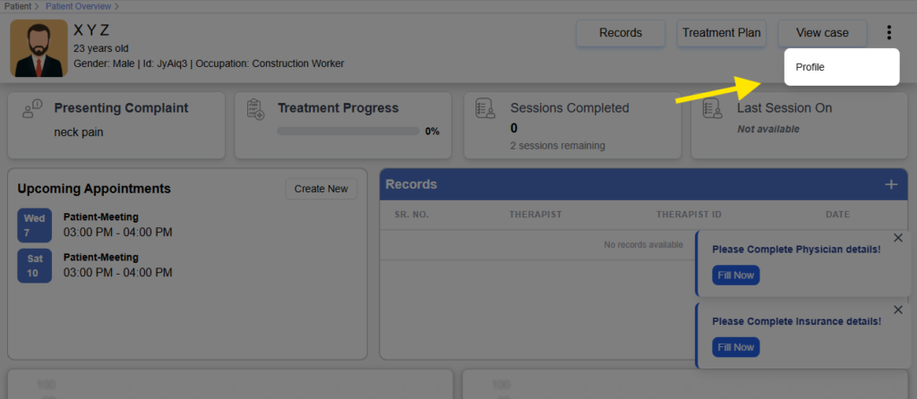 - From the dropdown menu, select Profile to open the patient’s profile page.