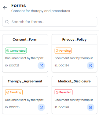 When a therapist assigns documents to a patient, they will appear in the Forms section in a grid layout.