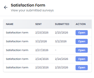 In the Satisfaction Forms section, patients will see a list of surveys in a table format.