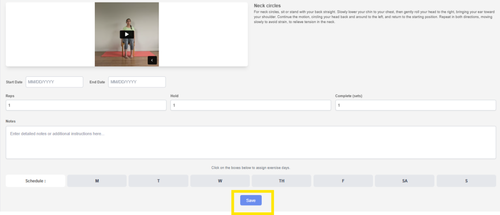 In the form, provide the necessary information including the start date and end date, the number of repetitions (reps), sets, hold duration (if applicable), patient notes, and the number of days per week the exercise should be performed.